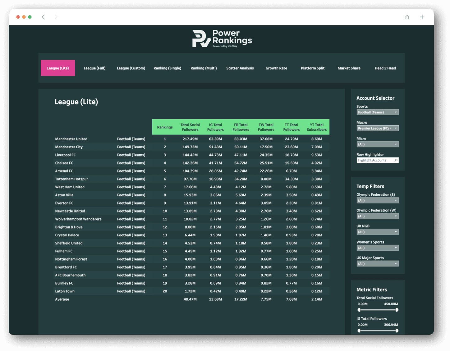 Power Rankings by WePlay, is the premier benchmarking platform for the sports industry.